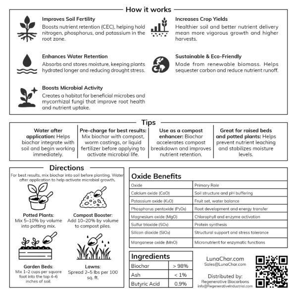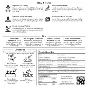 Supercharge your soil with Biochar — a natural soil conditioner that boosts fertility, enhances water retention, supports beneficial microbes, and promotes healthy, vigorous plant growth. Perfect for gardens, lawns, raised beds, potted plants, and composting.